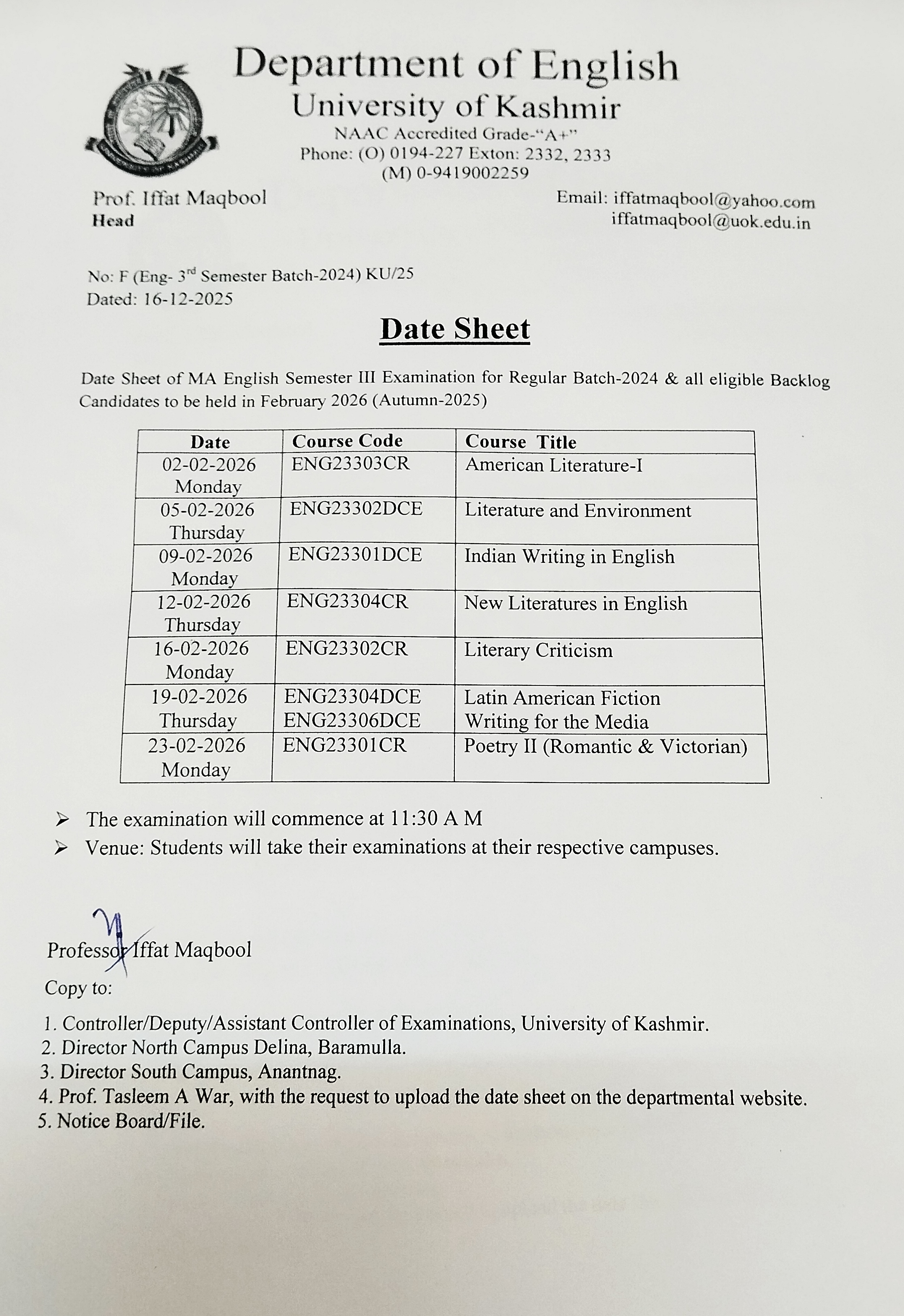 Date sheet of M A English, semester III (Batch 2023) and Backlog/ Division Improvement (batch 2020-22); Dated: 12-12-2024