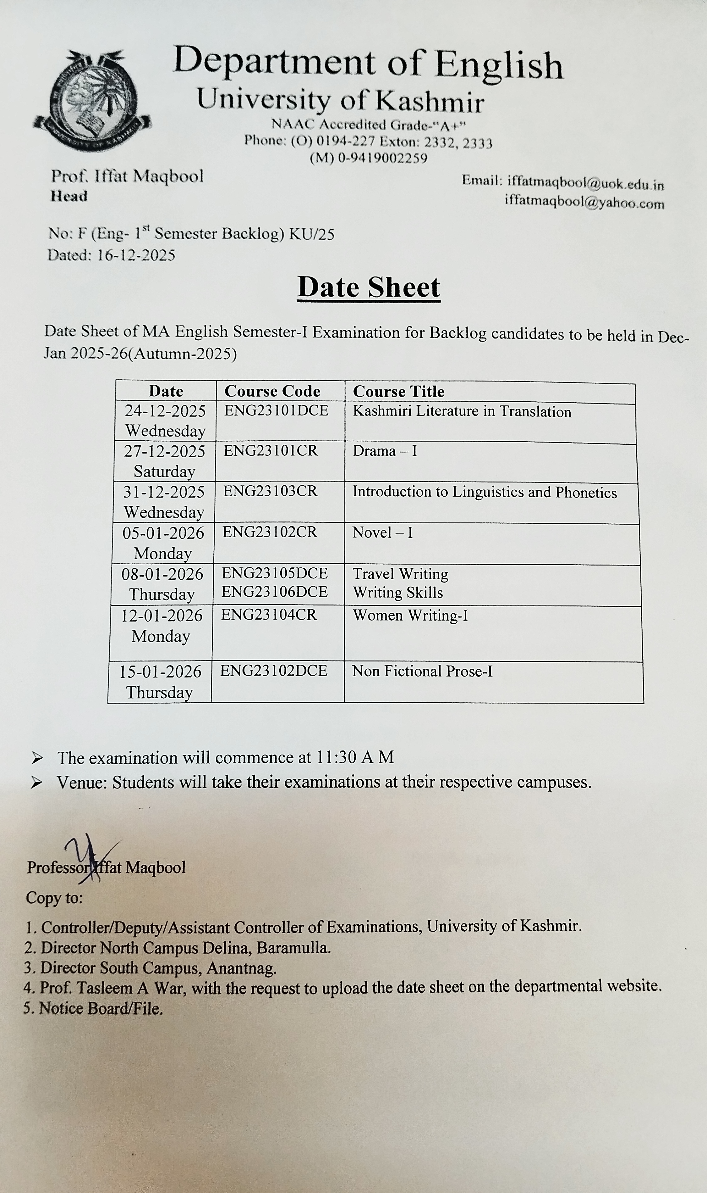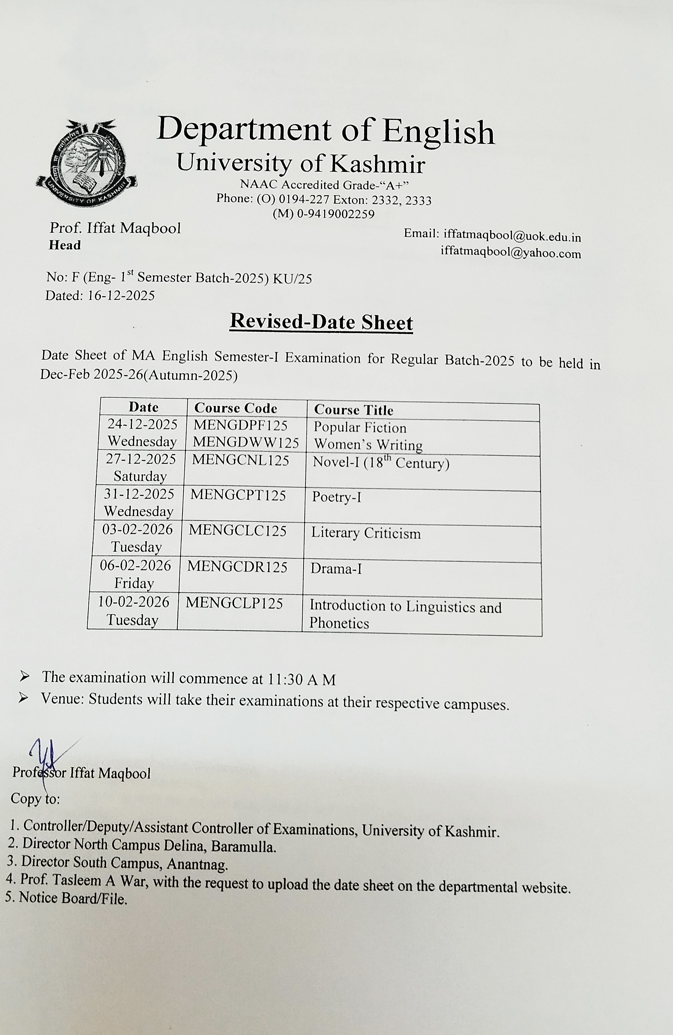 Revised Date sheet of M A English Semester I Batch 2023 & Backlog/ Division Improvement (Batch 2019-22); Dated: 26-12-2023