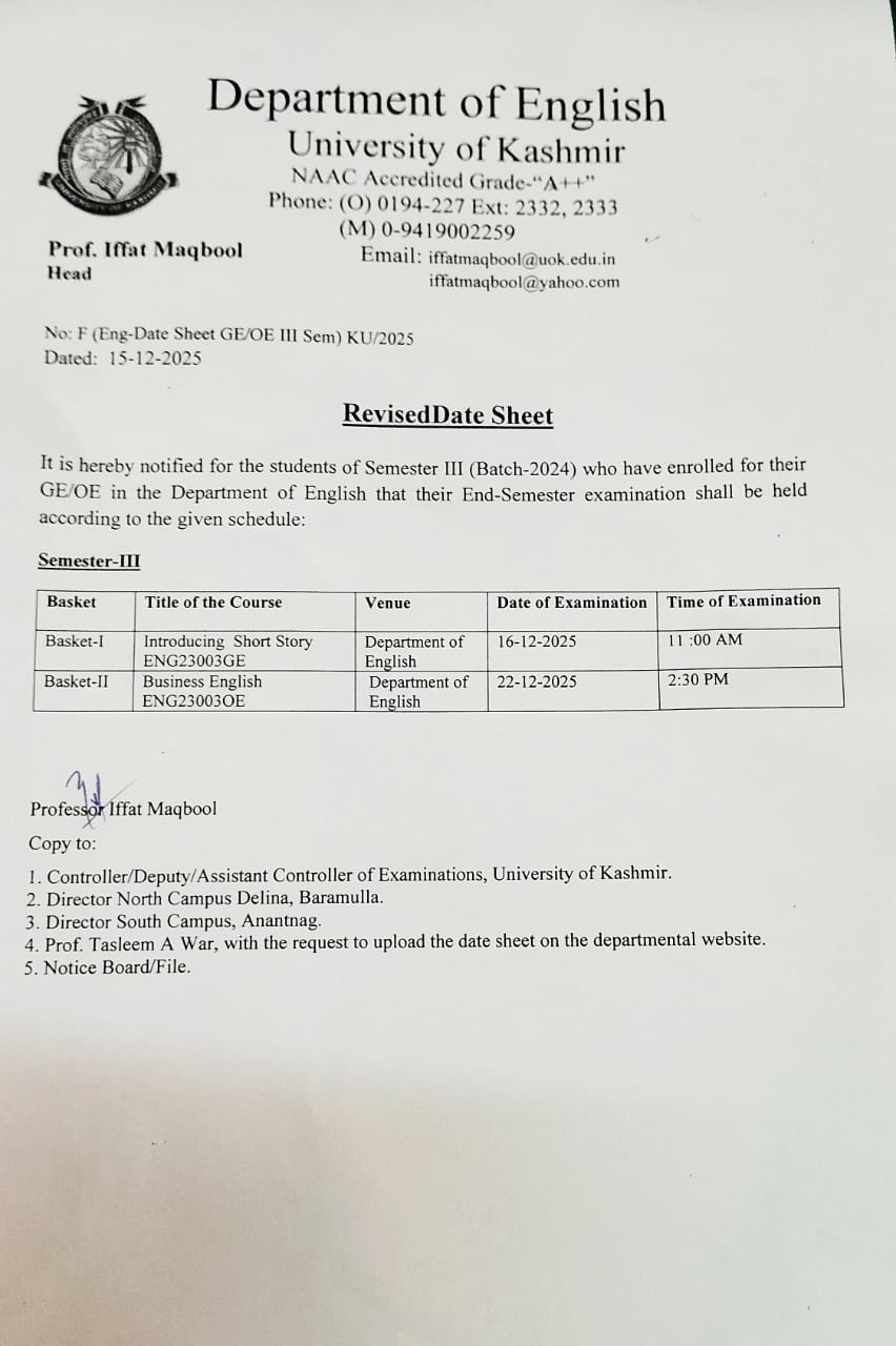 Revised Date Sheet of semester III (Batch 2023) & Backlog 2020-2022.; Dated: 30-12-2024